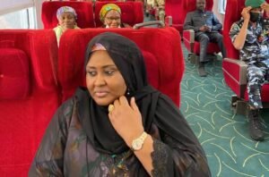 Aisha Buhari, Nigeria’s First Lady and wife to President Muhammadu Buhari was captured in a rare image sitting on a train headed to Abuja from Kaduna.