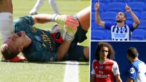 Arsenal German keeper Bernd Leno was carried off on a stretcher with what looked like a serious knee injury during his side’s game at Brighton which ended 2-1 in favour of the home team Brighton. The game was stopped in the first half while Bernd Leno received treatment on the pitch after his knee appeared to give way after landing awkwardly.