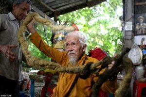 Ninety-two-year-old Nguyen Van Chien, who has not cut his hair for 80 years has revealed that he will die if he chops his locks which have dreadlocks five yards long.
