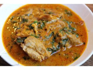 The soup can be eaten with pounded yam, semolina, garri and cassava fufu et cetera.
