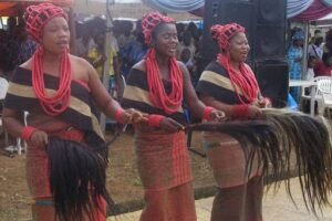 They also use black-horse-tail which is moved with dexterity while dancing to their music accompanied by the agogo (gong) and drums.