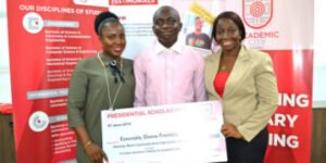 Ekene Franklin Ezeunala, a student of Meiran Community Senior High School, Lagos, scored 347 out of a possible 400 in the UTME – the highest in the country. The lad received the scholarship not just because he scored the highest in the UTME but because he had been recommended by Prof Adewale Solarin, who runs the non-profit organization, International Academy for the gifted. Ekene was presented the scholarship in the presence of his mother, Mrs Chinelo Ezeunala, a team from his school led by the Vice Principal, and Prof Solarin at the University’s Lagos office in Isolo.